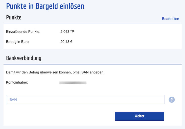 Über diesen Link kommst du nach Eingabe deiner Login-Daten aber direkt zu einem Formular, wo du zuerst die Anzahl der Punkte und anschließend deine IBAN eingeben kannst. Danach wird der Gegenwert auf dein Girokonto überweisen.